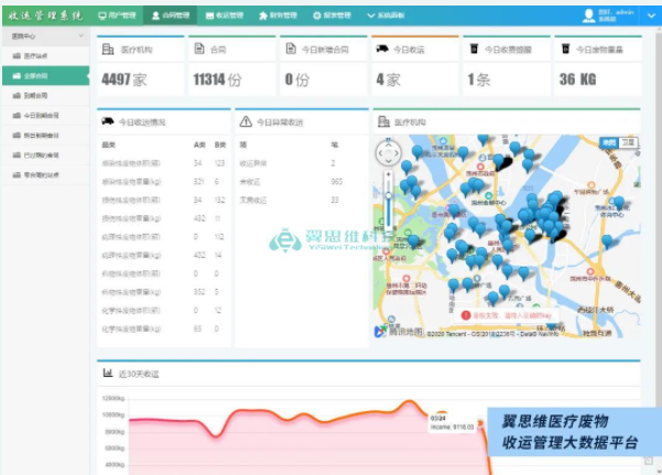 翼思维医疗废物收运管理平台支持多类别数据分析与统计,对医废产量进行智能化趋势分析,便于医院及各级监管单位对医废数据以及医废耗材的使用发放进行规范化管理,系统实现医疗废物的全程闭环追溯,有效杜绝医废的非法流出。