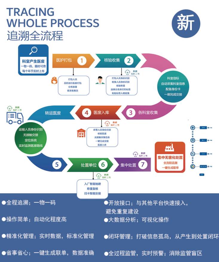 医疗废物源头称重,分类管理,标准规范、数据准确;智能身份卡识别,交接过程规范,电子台账齐全;医疗废物产生即绑定溯源码,箱袋关联,入箱转移,交接转运全程封闭,安全可靠防泄漏;电子台账清晰,自动汇总统计,保留时间长久;系统智能预警,实现远程执法。