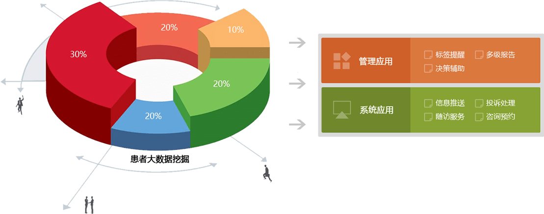 整合患者档案,通过大数据分析挖掘有价值客户,提取关键性数据,支撑医院满意度调查、投诉处理、随访等业务,同时输出经济、医疗量方面报告,辅助管理层重要决策。