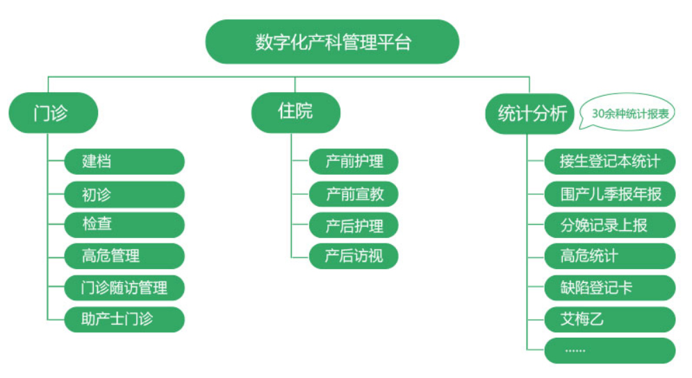 数字化产科管理平台是为医院产科量身定制的信息管理系统。它管理了孕妇从怀孕开始到生产结束42天以内的一系列医院保健服务信息。该系统由门诊系统、住院系统、数据统计模块三部分组成,与医院HIS/LIS/PACS/RIS等系统进行对接,完成数据的自动提取,集成和分析。集成孕妇门诊,住院和出院随访三个阶段信息,构建并打造出的一套完善的孕产妇保健信息化管理平台